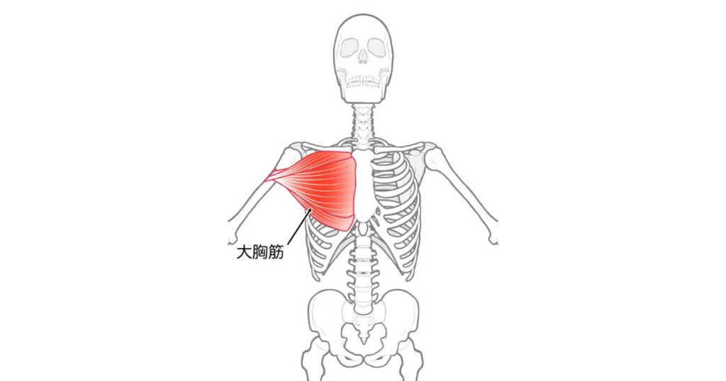 大胸筋は胸の前面にあり、鎖骨・胸骨・肋骨から上腕骨に扇状に付着している筋肉。